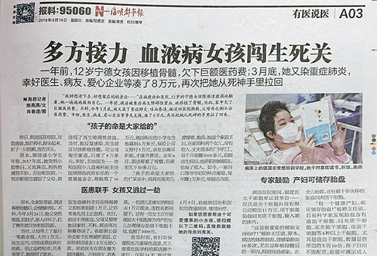 近日,海峡都市报发表报道《多方接力,血液病女孩闯生死关》。一位12岁的福建宁德女孩陈琪洁被查出患有再生障碍性贫血病,为了给孩子治病,家中倾其所有,并欠了巨额医药费。